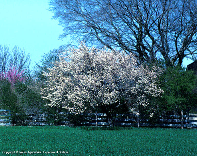 Like the Texas redbud, the Mexican plum is very drought tolerant, living on rainwater alone in all but the most extreme situations. It grows 15 to 35 feet tall by up to 20 feet wide. The one-inch wide white blooms are an important pollen source for bees. Small oval plums—which will stain a sidewalk or patio—appear in late summer and are favorites of birds and small mammals.