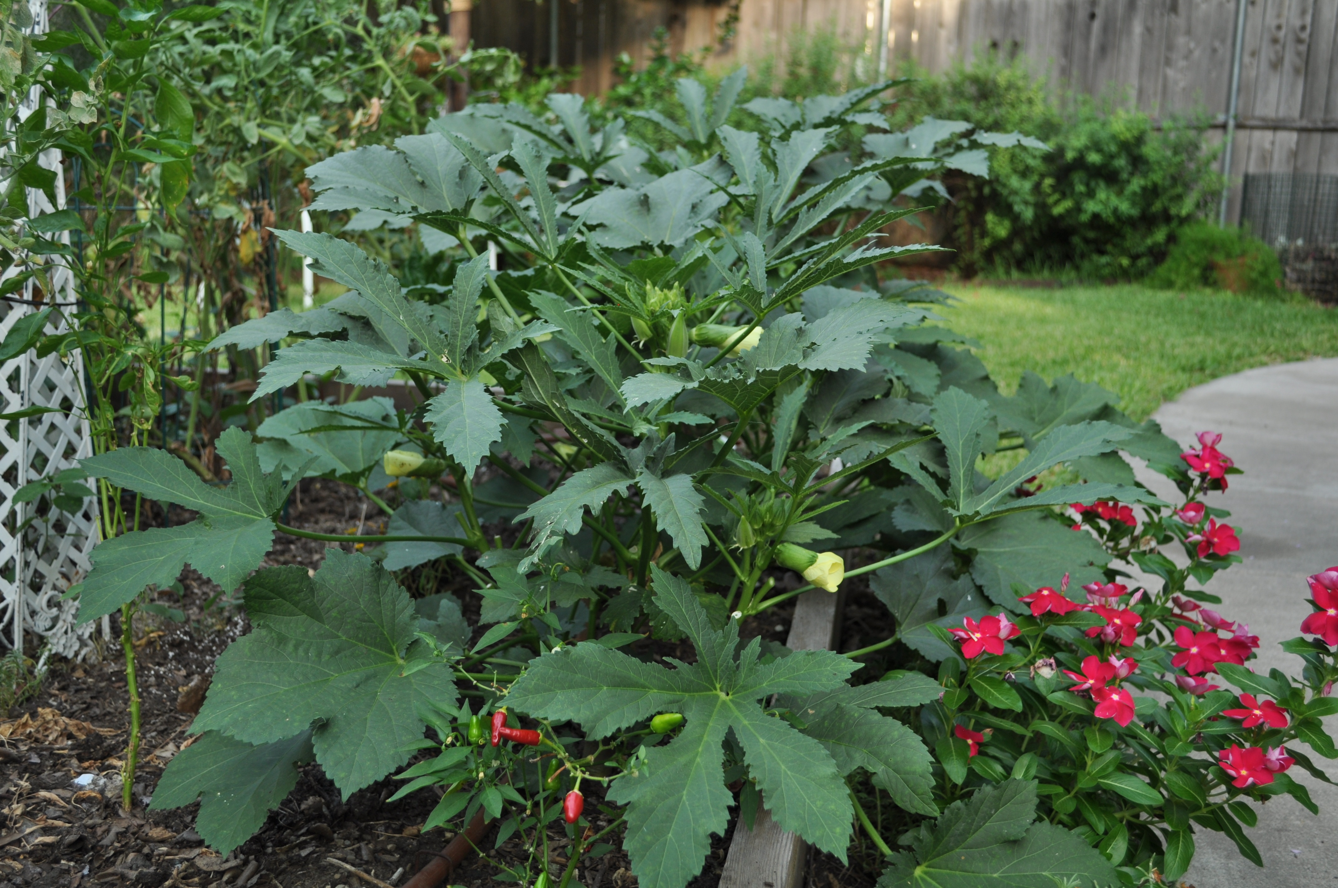 You can’t eat Okra leaves but how lovely they are to have in your garden. Harvesting Okra every day requires your careful attention and looking in and around the whole plant and under every leaf to find Okra that may be hiding. if you let it go an extra day, you end up with giant Okra good for drying and seed saving but not much else.