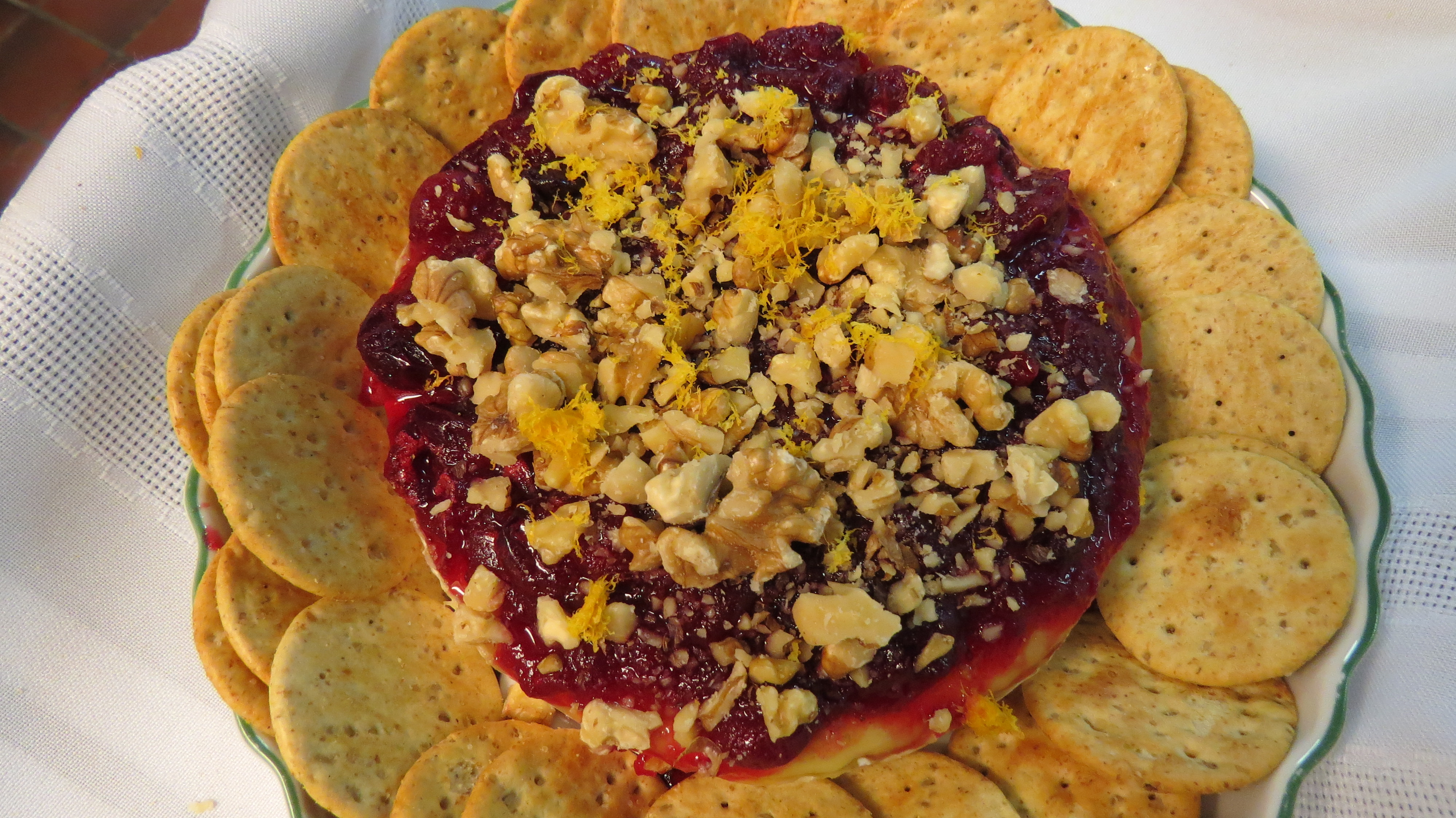 - Remove from the oven and top with the cranberry sauce. Bake for an additional 5 minutes, or until the cheese is soft and warm. Sprinkle the top with orange zest and walnuts.