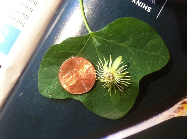 Have you always wanted to grow a passion vine but have too much shade to grow the showy purple Passiflora incarnata? Or perhaps you have a butterfly garden and are interested in providing one of the host plants for Gulf Fritillary, Julia and Zebra Longwing butterflies? Well, if you don’t mind having a Lilliputian passion flower that is only about an inch in diameter, then Passiflora lutea is for you.