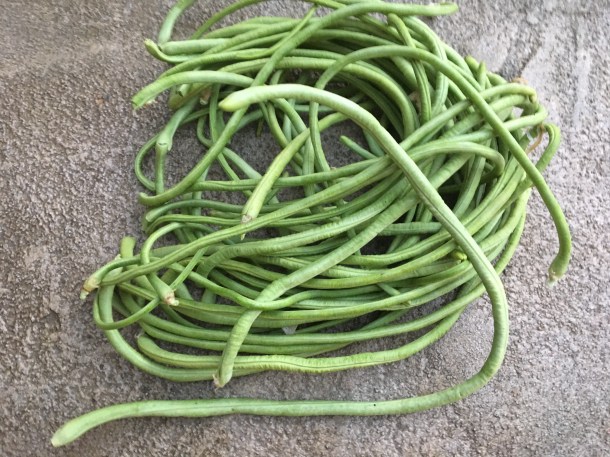 Does that mean no more fresh beans? No, not if you plant Chinese long beans. This delicious vegetable goes by many names: snake bean, yard long bean even asparagus bean. A red variety called red noodle is also available. Properly they are called Vigna Unguiculata. As its “real name” makes clear, they are actually related to cowpeas or blackeyed peas and not ordinary garden green beans. The important point is they grow in the heat of summer, in fact they require heat to do well. Which wouldn’t matter if they didn’t taste good, but they do with flavor much like green beans and a touch of blacked pea.