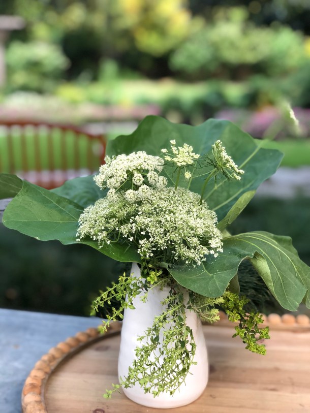 Carrot blossoms, eggplant leaves and lemon thyme keep up the beat.