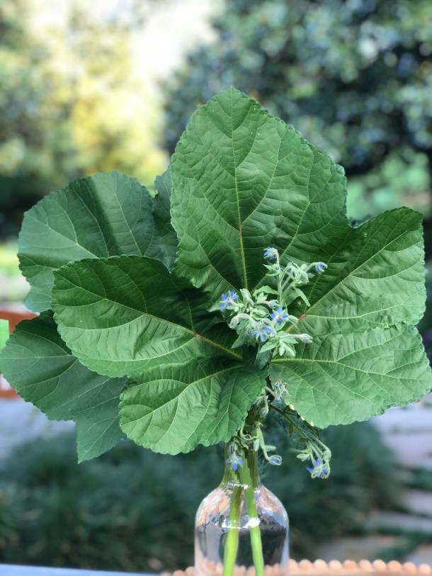 Okra leaves and blue borage in perfect harmony.
