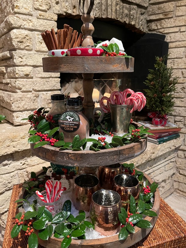 One concept that starting trending a few years ago is the “Hot Chocolate Bar”. This three-tiered stand sprinkled with faux snowflakes is an attractive way to invite guests to indulge in the experience. Cinnamon sticks, spoon shaped peppermint sticks, hand crafted marshmallows and chocolate chips make customizing your cup of cocoa fun and easy. Burford holly branches bursting with red berries complete the look.