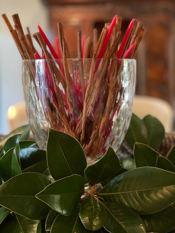 For many years, I’ve accumulated a nice collection of pinecones given to me by friends …some from Oklahoma, others from east Texas. While the natural look is my preference, many of them have been embellished with bright silver or 24 kt gold spray. Over the years they’ve been used in a multitude of ways but this year I decided to combine them all into one large wooden dough bowl filled with greenery from my yard. Japanese Plum Yew and Boxwood clippings were plentiful this year and added a lovely green accent. If you are drawn to the rustic chic design aesthetic, here’s a little glitz and glam to give it some holiday sparkle.