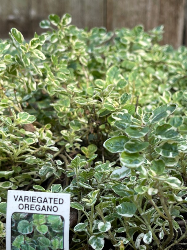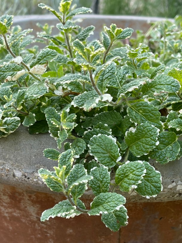 For 2021 our plan is to explore and find creative ways to use variegated edibles in the garden. Several plants had a pre-introduction this past fall: variegated society garlic in the raised sidewalk beds and lemon variegated thyme in the Mediterranean bed are up and growing. But there’s more to come.