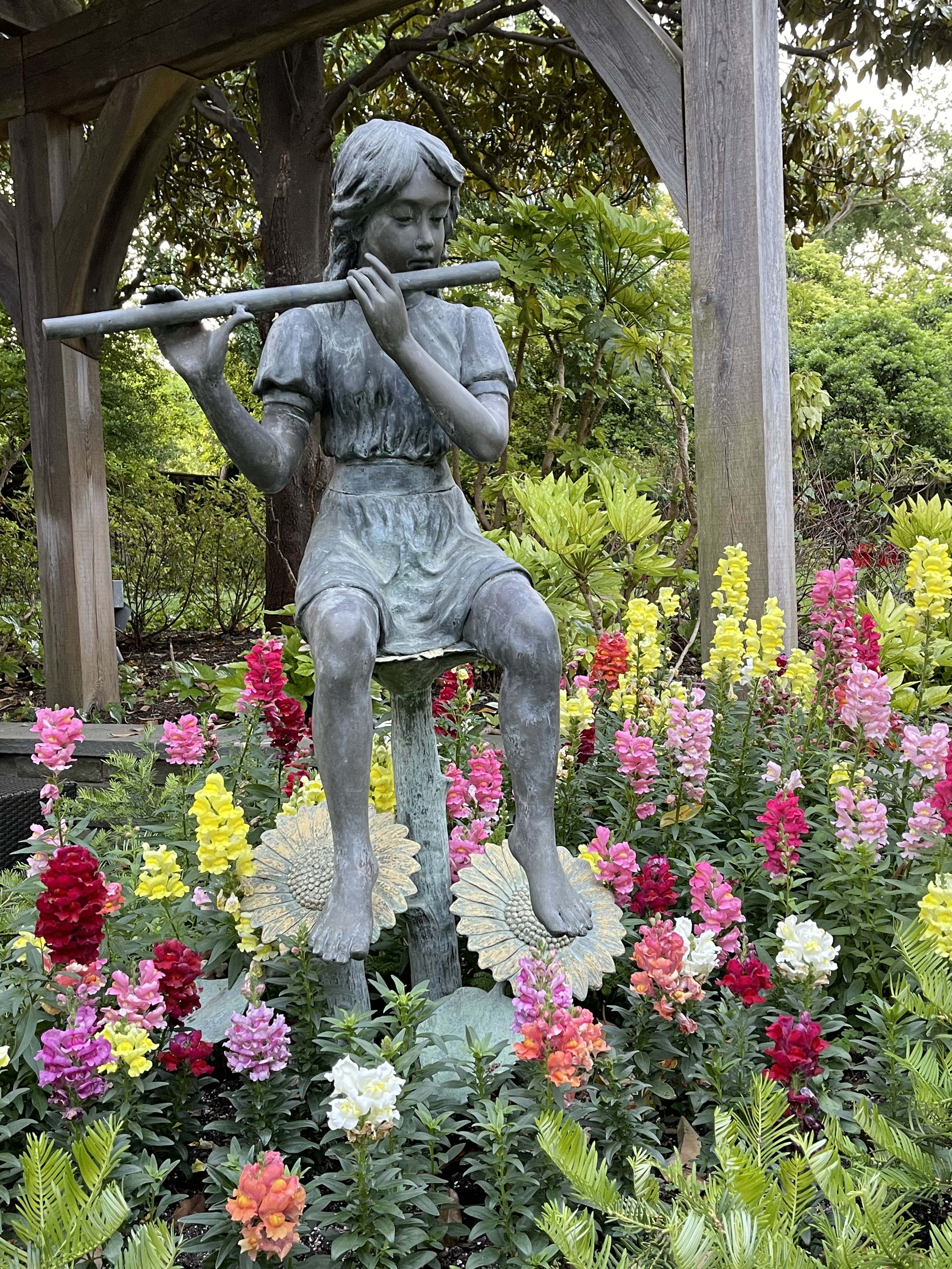 She was a gift many years ago from my husband who somehow knew that her presence in the garden would make me smile. We named her “Sunflower Girl” as a tribute to my love of mammoth sunflowers. But the flute she gently caresses in her hands speaks sweetly to me of bygone days.