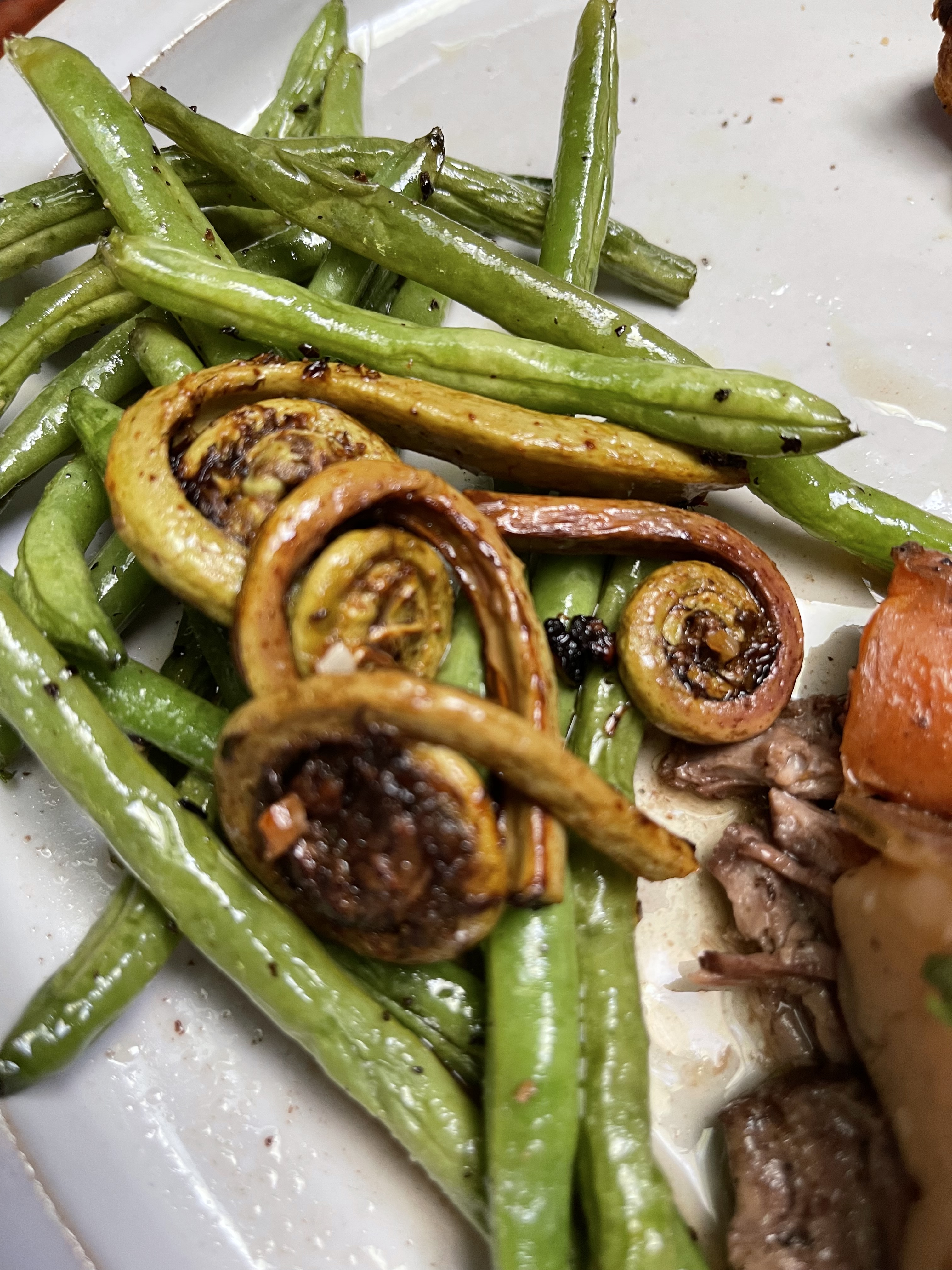 Our lightly sauteed fronds made a nice topping for some freshly roasted green beans. The taste profile, according to online sources, is best described as mildly nutty with flavor notes of asparagus, spinach and/or green beans. My husband and I agreed that ours were more closely aligned with a hint of asparagus. It was a delightful taste experience that we may enjoy again.