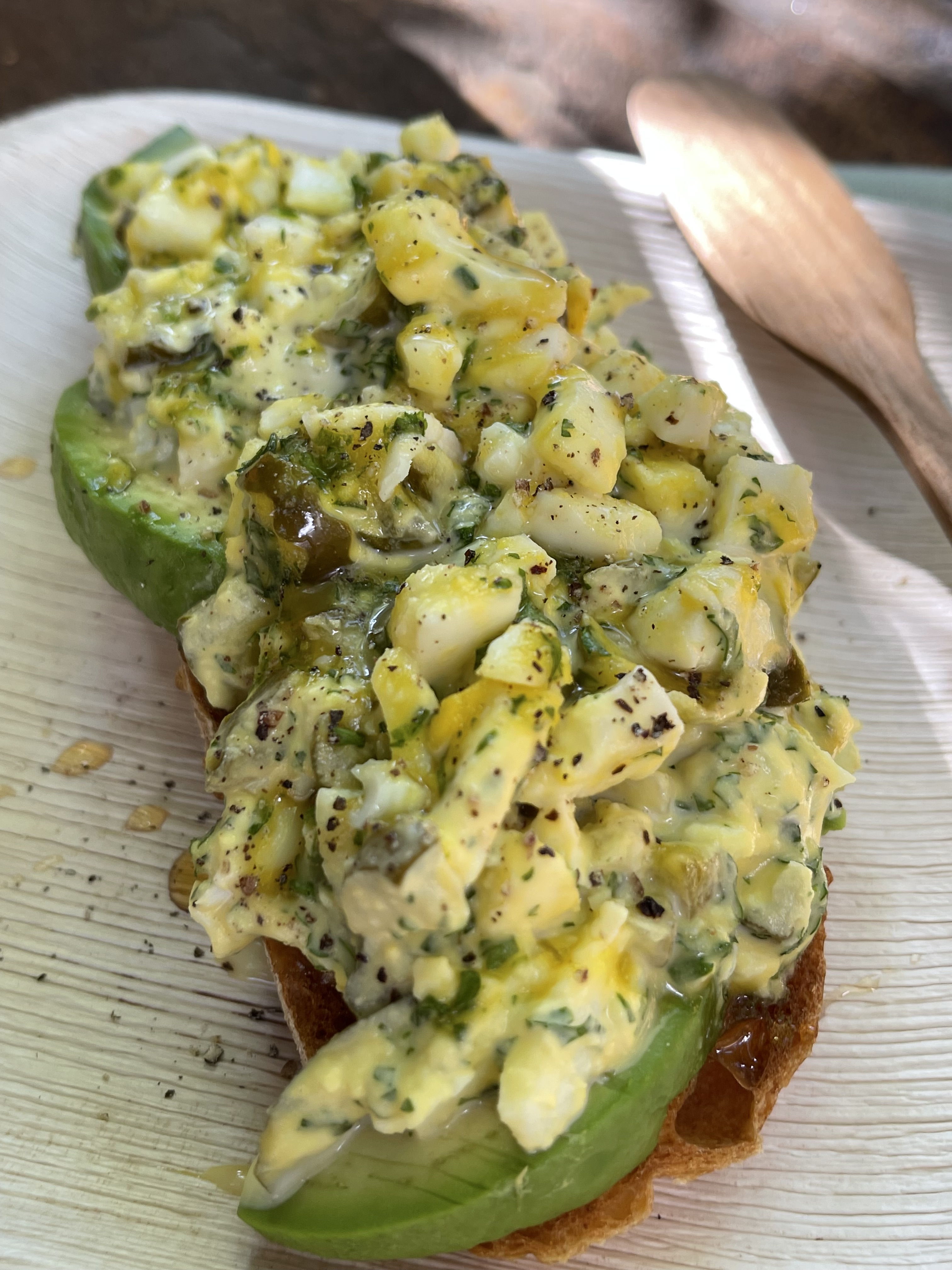 Egg Salad Toast with Hot Honey Drizzle on the right.