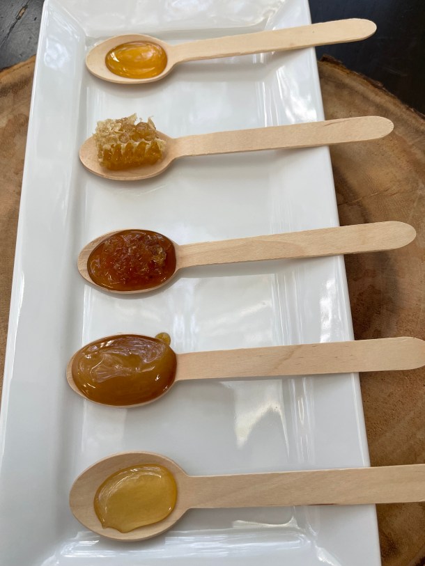 Top to bottom: Liquid Honey, Comb Honey or Honeycomb, Chunk Honey, Crystallized or Creamed Honey and Flavored or Infused Honey