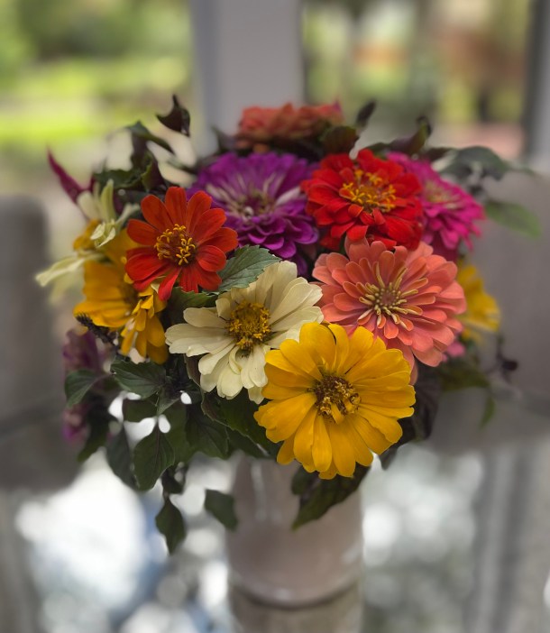 To start, we’ll begin with a quintessential summer flower – zinnias! Offering one of the most colorful palates found in the garden, zinnias bold and bright blooms range from white to orange, pink, yellow, purple and red. We’ve chosen to combine our blooms with another plant that is thriving in the Dallas heat – basil.