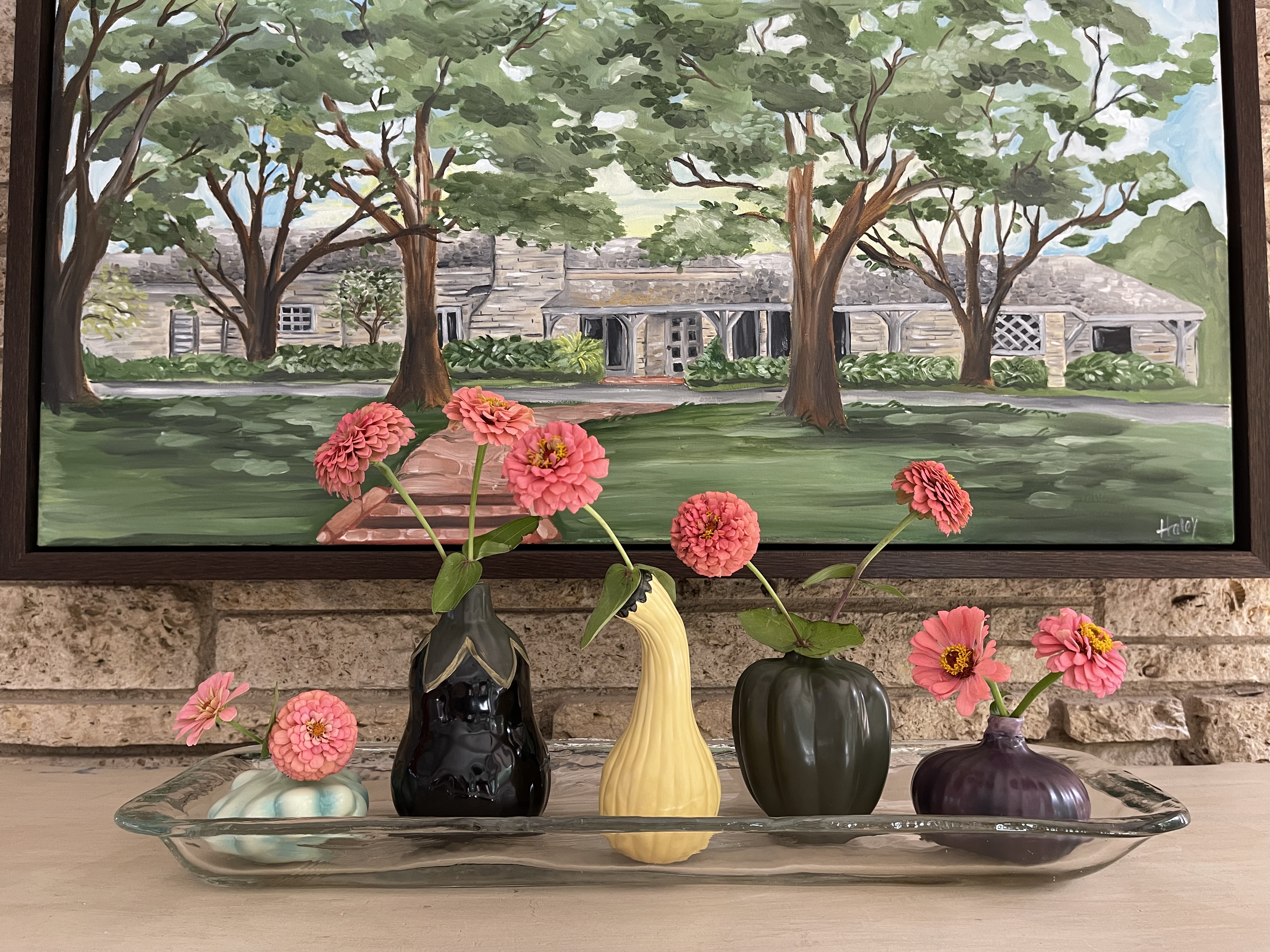 And finally, for a moment of simplicity, use individual blooms as illustrated in this arrangement. A collection of vintage ceramic vegetable vases sitting under an oil painting of our house needs only a delicate touch to enhance its beauty. The soft tones of puffy little salmon zinnias are the right choice!