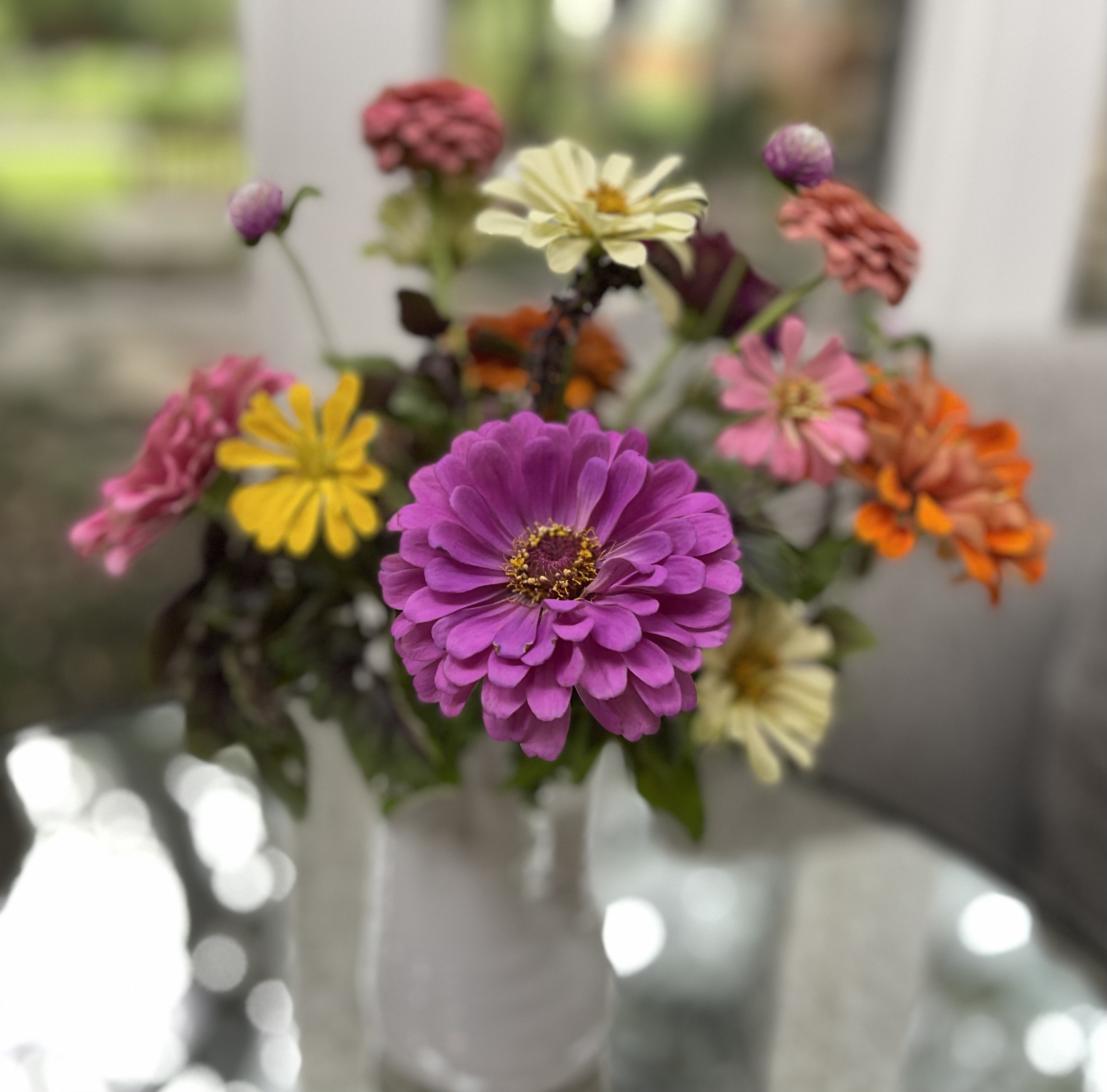 If a compact, tight arrangement seems a little too crowded, consider going in a different direction. Give each zinnia space to breath while making its own individual statement. A flower show judge might suggest that a more open design reflects the natural habit of flowers growing in the garden. In this type of arrangement, there’s plenty of room for “a butterfly to move from bloom to bloom”.