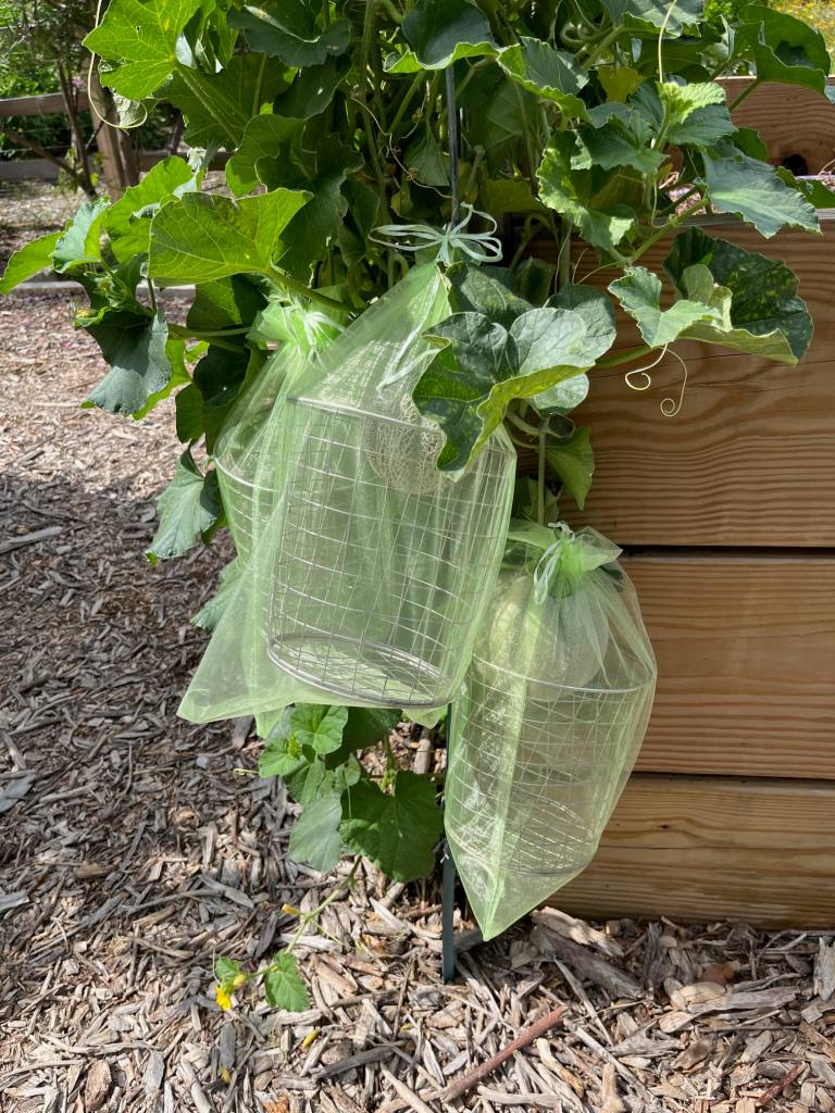 It’s day five of our cantaloupe witness protection program and no losses yet. We were finding many half eaten green cantaloupes around the garden before deploying this improvised metal cage plus mesh bag system.