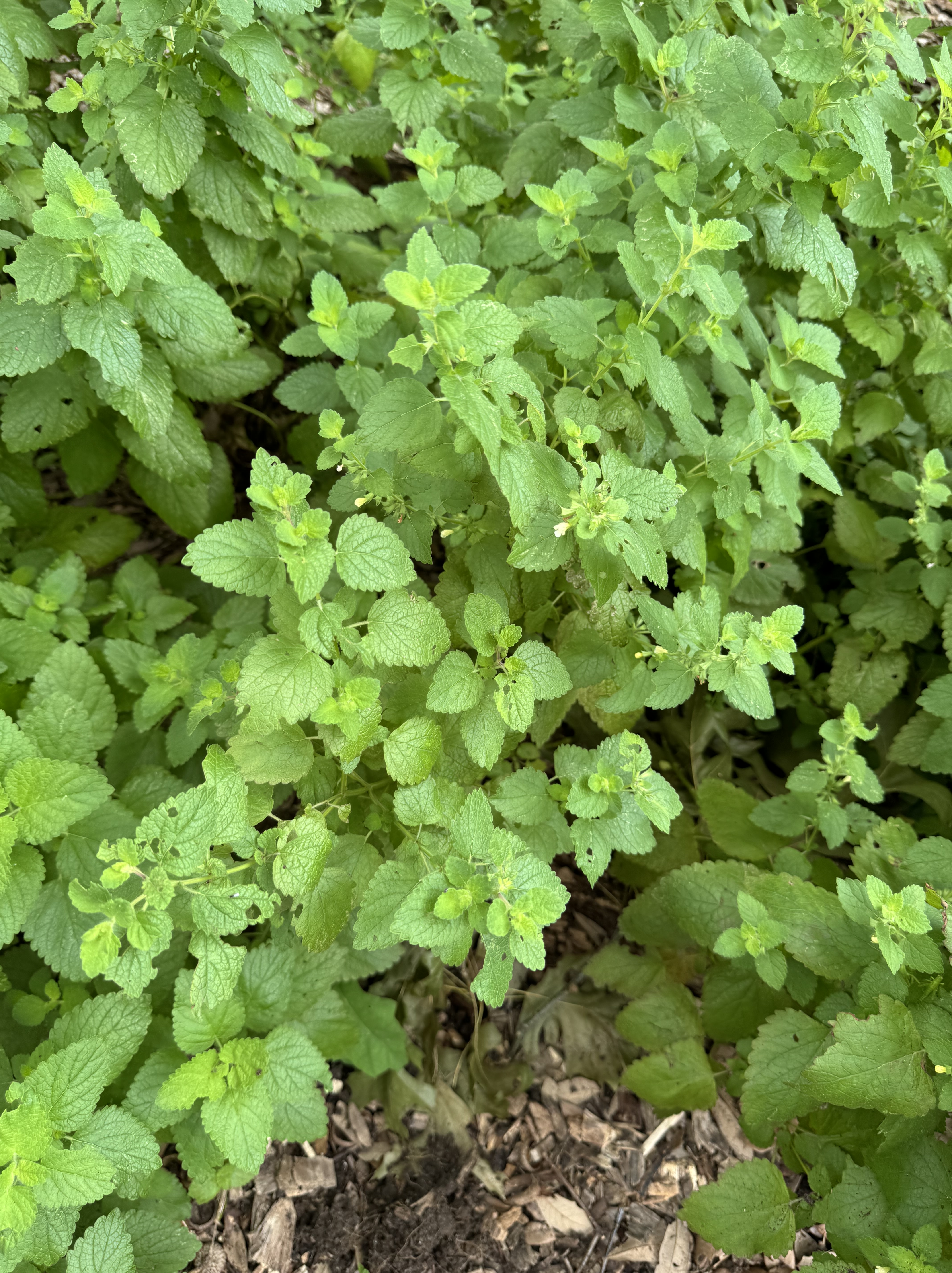 Lastly there is Lemon Balm, another member of the mint family, (Melissa officinalis). Native to Europe, It can be found in many places, but most recently has been thinned from the Hügelkultur in the Edible landscape. It grows in a clump, with wrinkled leaves that have a scent of Lemon. The flower is an insignificant spiky pale-yellow cluster. This herb is said to produce calming effects. It seeds and spreads readily and can get 3 feet by 2 feet. It consistently returns in the garden. It can be obtained in the herb section of garden centers or possibly a garden friend would gift you a start.