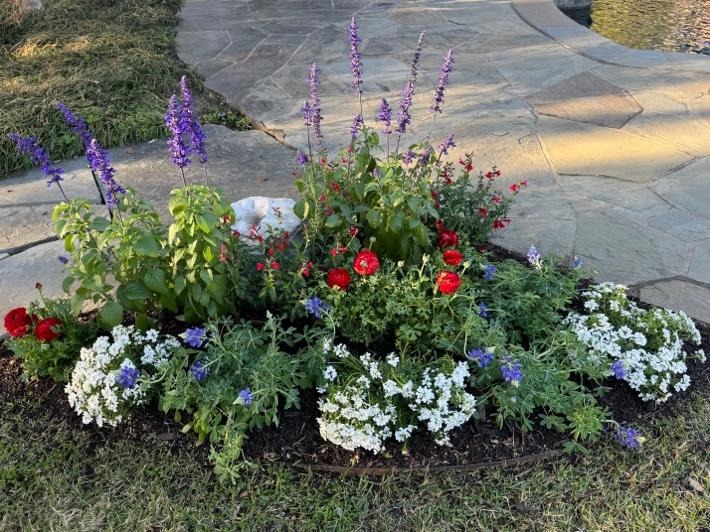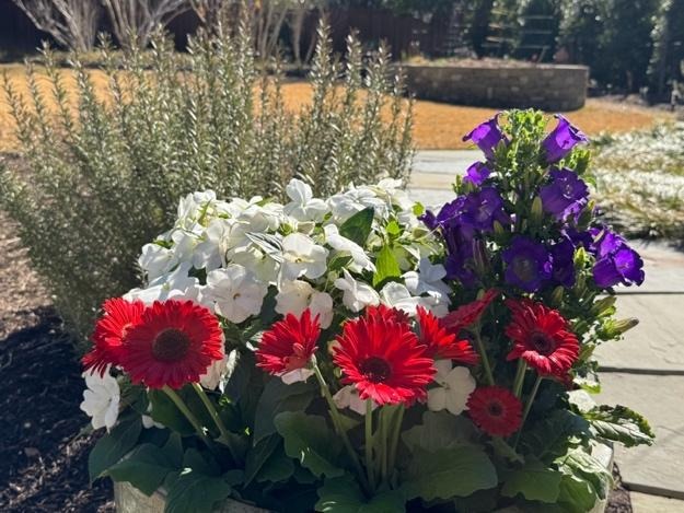 Red: Geraniums ‘Santana’ (An interspecific, heat tolerant variety) White: Alyssum ‘Sweet White’ Blue: Pansies