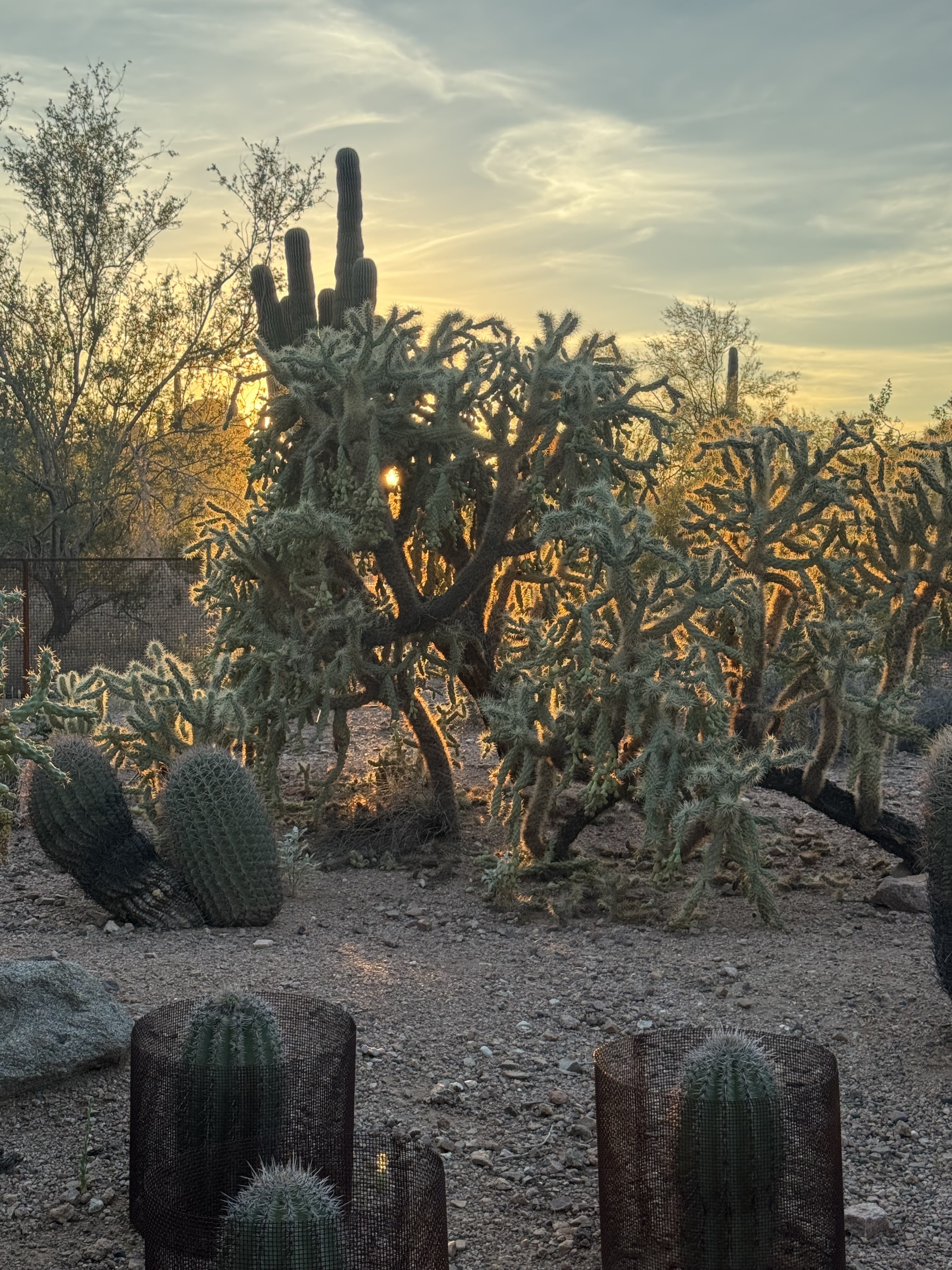 Fading sun behind a series of cacti-Echinocereus, with the prickly Cylindopuntia,known as cholla, and a saguaro behind that