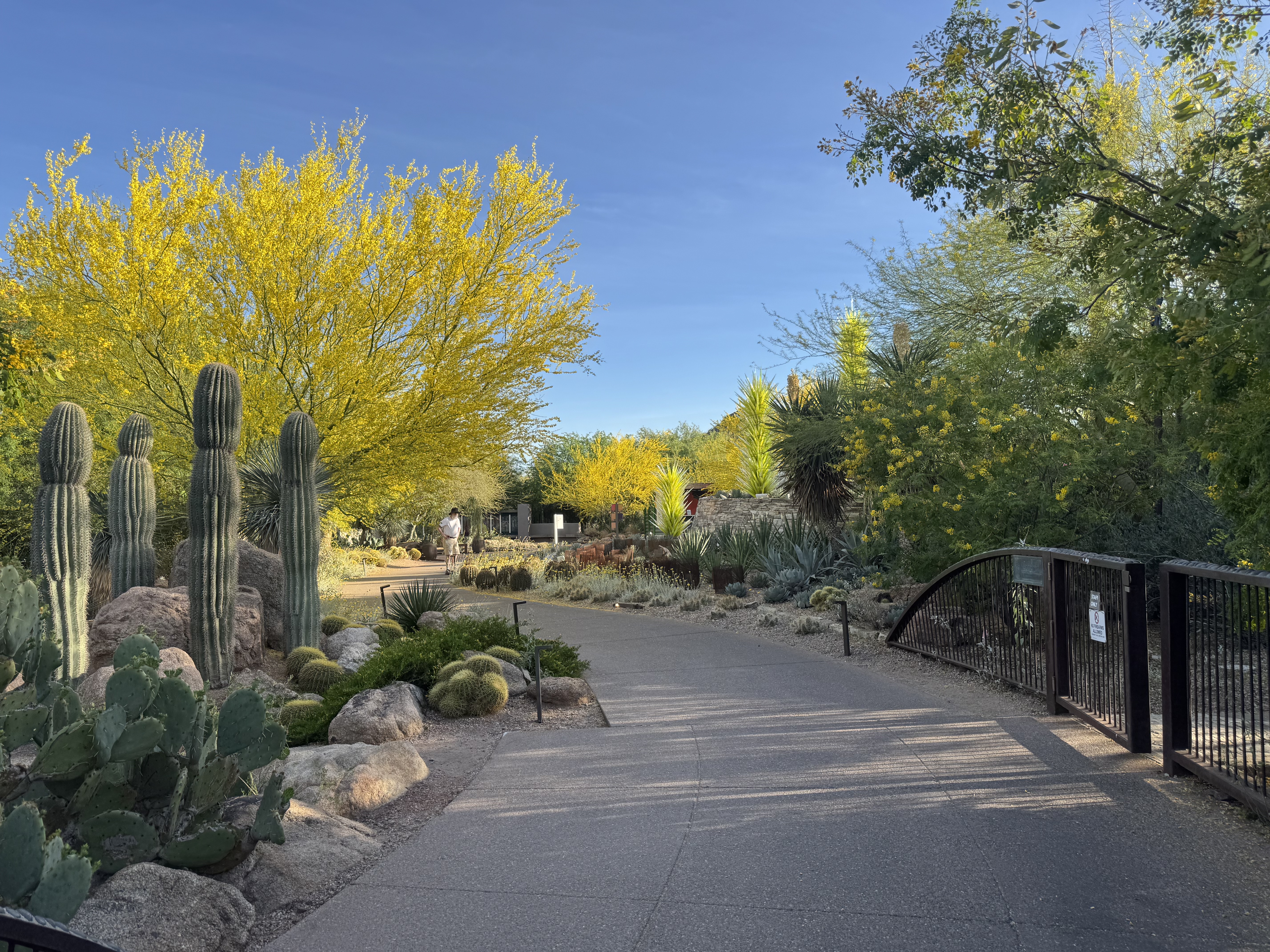Yellow Palo Verde tree at entrance of Desert Botanical Garden along with Yuccas, Cacti  and even some Chihuly glass sculptures.