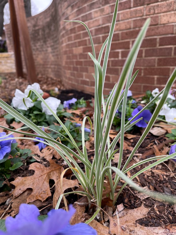For 2021 our plan is to explore and find creative ways to use variegated edibles in the garden. Several plants had a pre-introduction this past fall: variegated society garlic in the raised sidewalk beds and lemon variegated thyme in the Mediterranean bed are up and growing. But there’s more to come.