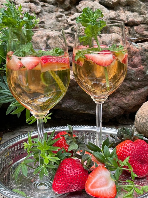 Tie the stems of the woodruff with a string and stuff it into the opening of the wine bottle, leaving the string outside the bottle. Let it soak for 15-20 minutes. Remove the bunch and serve the wine chilled. Note: Germans like to garnish the Maiwein with fresh strawberries and mint.