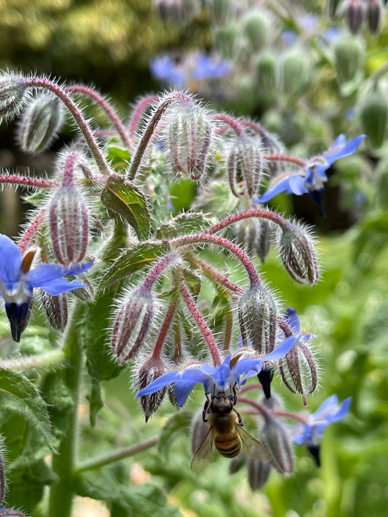 In our crescent bed, you’ll find both white and blue borage in full bloom. Bees are buzzing and can’t stay away from the striking star-shaped blossoms. Borage is an extremely old plant, originating from an area around Aleppo, a Syrian city that dates back to the eleventh century B.C. After spreading to Europe, Pliny the Elder wrote, “it maketh a man merry and joyful.” His comment, along with others, may refer more to the wine it was drunk in than the herb itself. Fresh borage flowers can be used in salads, dips and cold soups as a garnish.