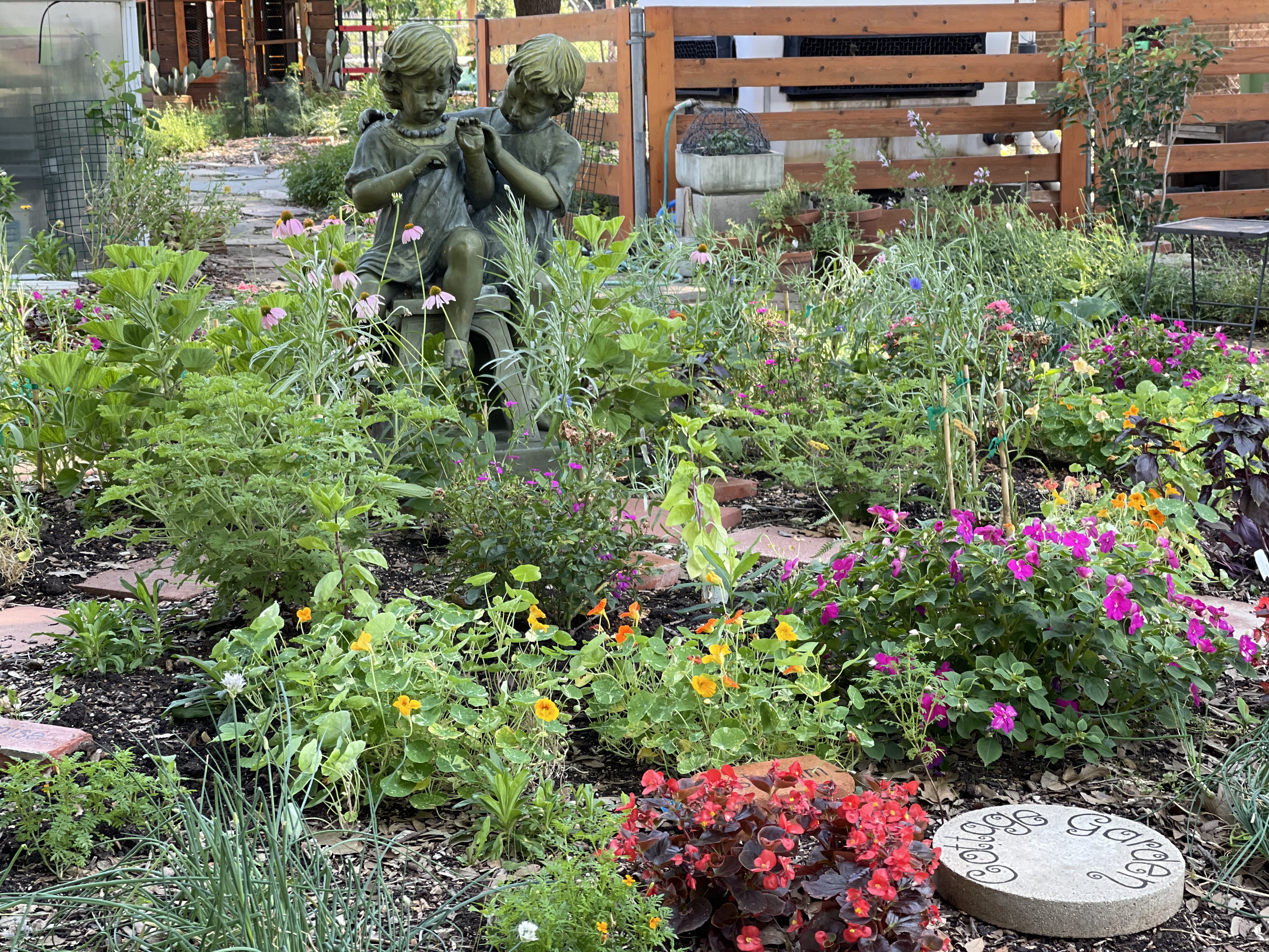 In conclusion: Six months later, the circular bed once referred to as our Statuary Garden has been reclaimed and given a new identity. Yes, the adorable bronze statue of a little boy and girl remained in its original location, a constant reminder that the entire edible landscape was once a much-loved children’s playground. The same four pie-shaped wedges now feel more relaxed with their harmonious gathering of edible flowers, herbs and a few vegetables. We are overjoyed with the seasonal arrangement of jewel tones displaying their glowy color palette. Varying shades of green gracefully weave their way through a tapestry of color bringing a sense of harmony to each bed. Our new ‘Cottage Garden’ stands proudly as the focal point of the edible landscape. As with the cottage gardens of old, we are hopeful that ours will evolve slowly over time, changing with the seasons yet always impressing with its charm. Please enjoy your visit to our garden whenever possible.