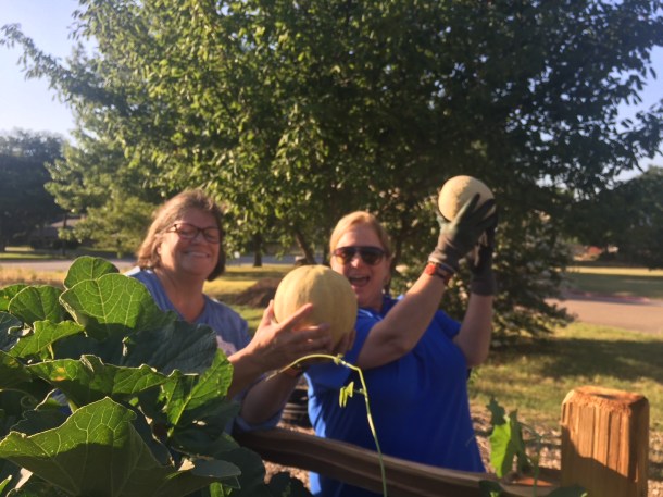 Working together we quickly harvested 44 pounds of perfectly ripened cantaloupe that we donated to North Dallas Shared Ministries. We also harvested another 12 pounds or so of imperfect fruit that we tasted and shared among ourselves.