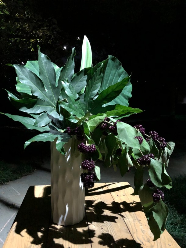 You might think of this arrangement as something akin to the “moody blues”. Drooping, berry laden branches create a somewhat mystical scene captured in this nighttime photo. Aralia and elephant ears leaves lend the right amount of weight needed for balance. FYI…this arrangement is best used in an outdoor setting. Beauty berries inside the house aren’t worth the worry.