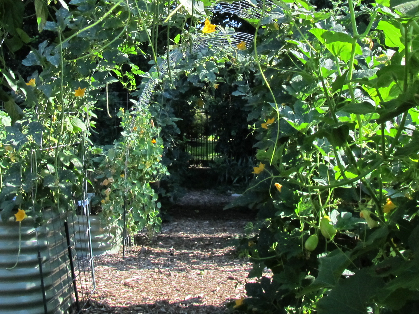 Another issue is the vines grow over 10 feet long and quickly sprawl throughout the garden. At Raincatcher’s they grew over large trellises and into the raised beds and grape arbor on the opposite side.