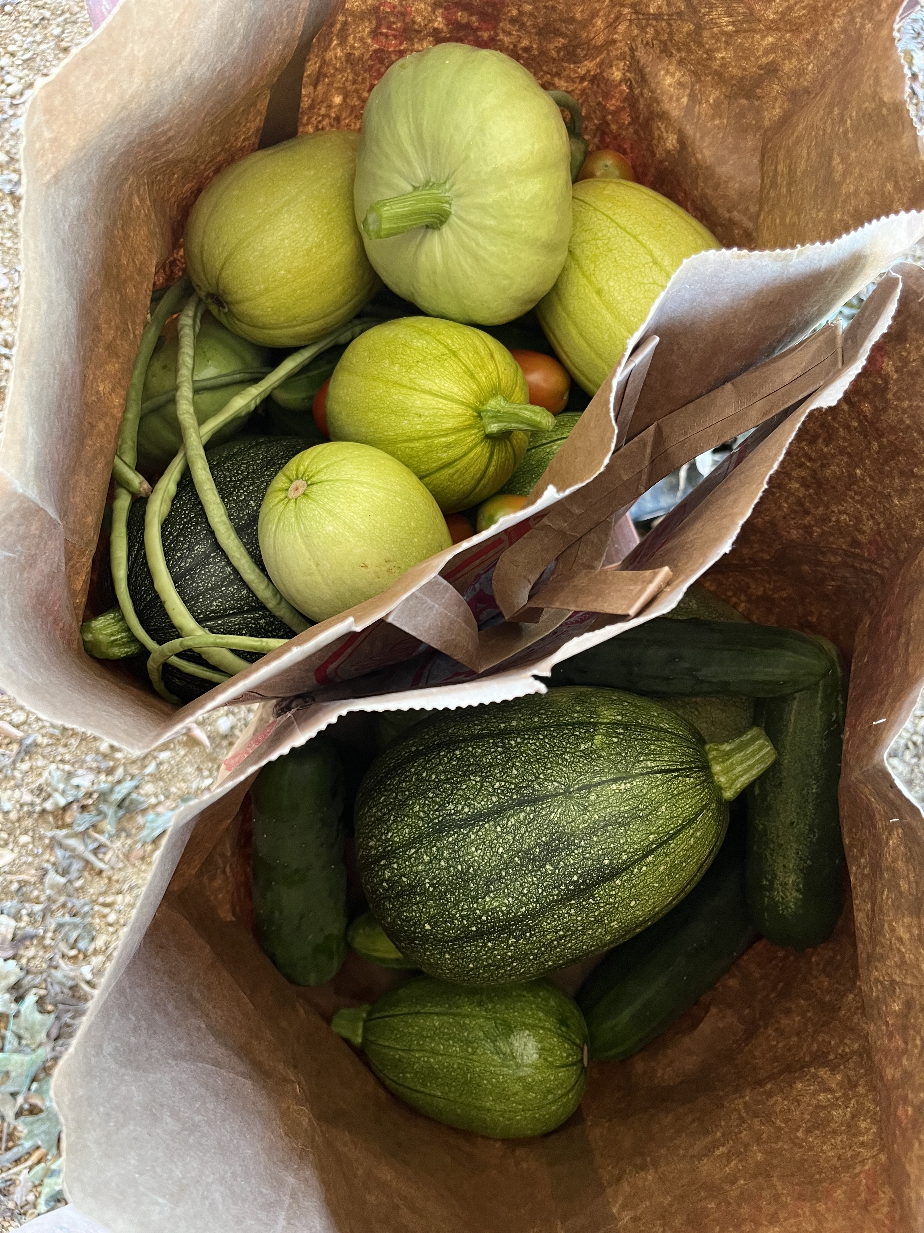 Calabacita is delicious, especially when harvested at tennis ball to softball size. It can also be eaten as a soccer ball size pumpkin and stores well at the larger size. It takes a little more effort to prepare the larger size, so the gardeners included cooking instructions with donations.