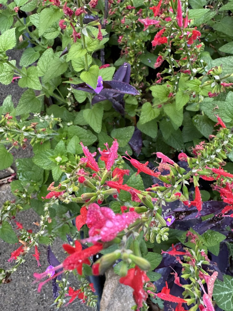 Turk’s Cap loves summerCenzio is ok with heat, even seems to like itRosemary is not complainingYard pointsetta and white veined piple vine are okay with heat but do like shadeSalvia coccinea keeps going when the going gets tough