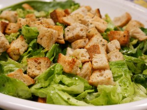 Without removing the crusts, cut the bread slices into 1-inch cubes. In a large skillet, heat the olive oil over medium heat. Add the garlic and sauté until translucent, 1 to 2 minutes. Add the bread cubes, reduce the heat to low and cook slowly, turning once, until golden and crusty, 4 to 5 minutes on each side.