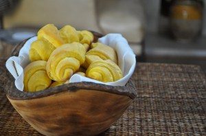 1. Punch dough down, and divide into 3 equal parts. Roll each into a 12-inch circle on a lightly floured surface; spread each circle with 1 tablespoon plus 1 teaspoon butter. Cut each circle into 12 wedges; roll up each wedge, beginning at wide end. Place on lightly greased baking sheets, point side down, curving slightly to form a crescent.