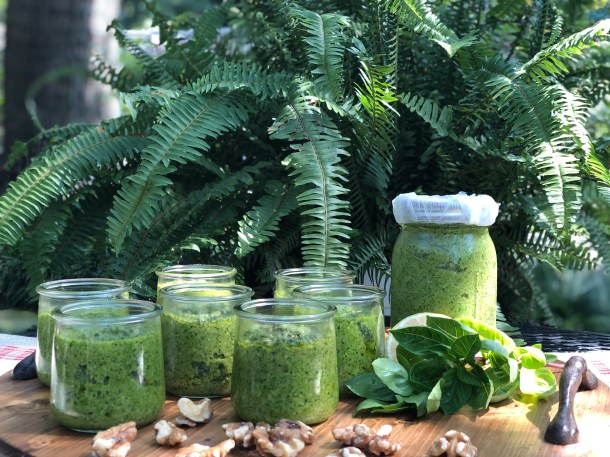 Amidst all the chatter and finger licking swipes, it was hilariously entertaining to see each batch being scooped out of the processors. Varying shades of green, silky smooth texture or visibly chunky little pieces of spinach and nuts didn’t matter. Each jar was filled with a pesto that yielded its own distinct personality. And, our chefs were thrilled to take home over 30 jars of garden-fresh pesto for their personal enjoyment or to share with family and friends.