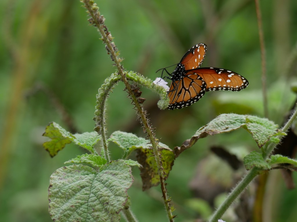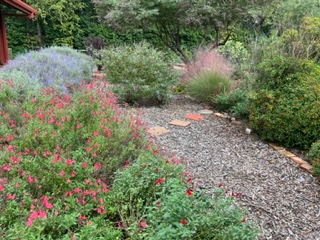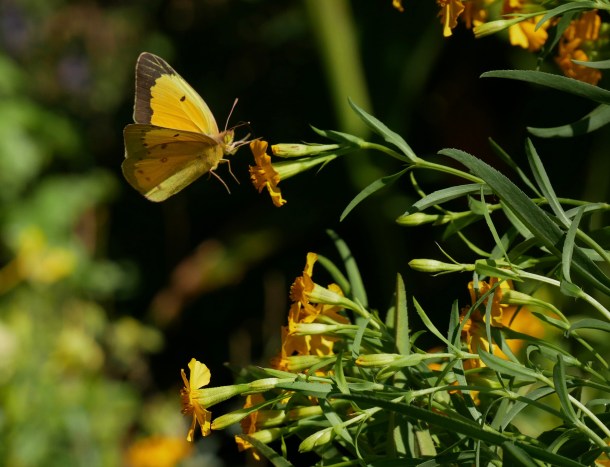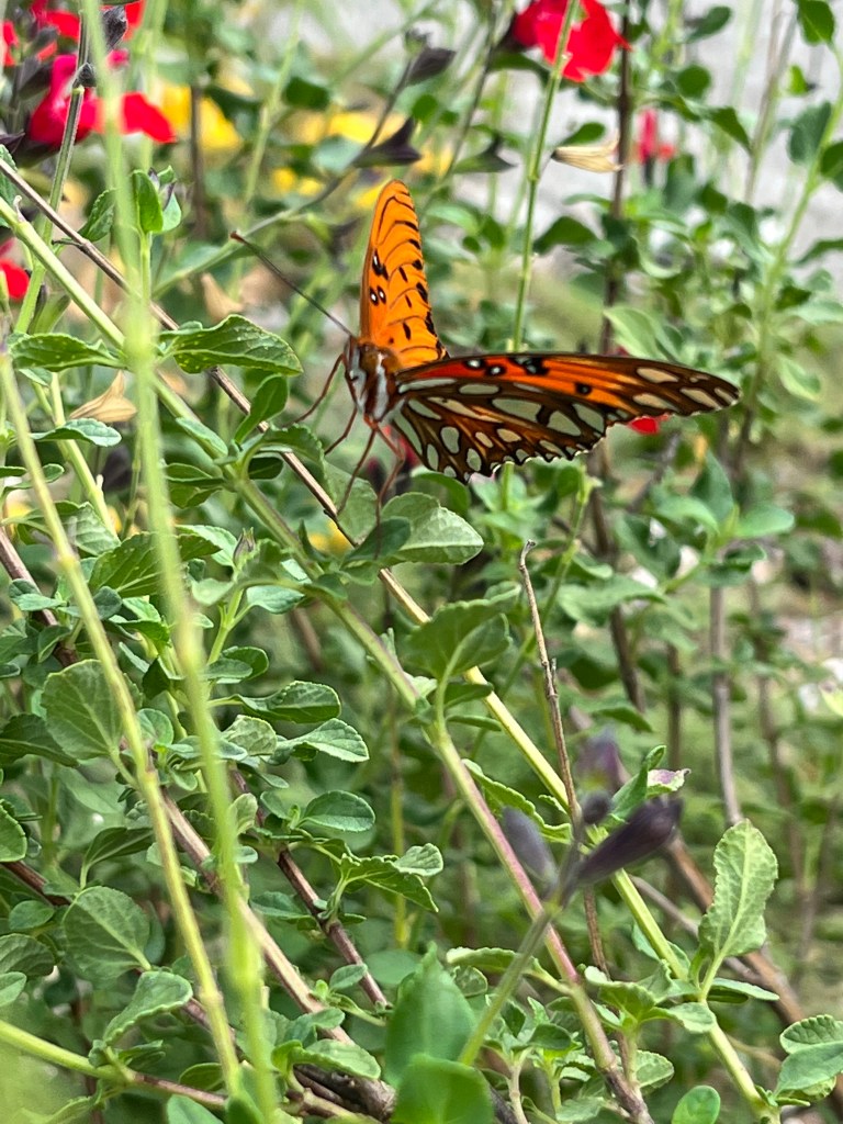 Gorgeous walkways brimming with colorLots of pollinators like this Orange Sulphur on Mexican Mint MarigoldA Gulf Fritillary on Red SalviaA Queenpoised for her next flight And a Morning glory blossom hosting a honey bee